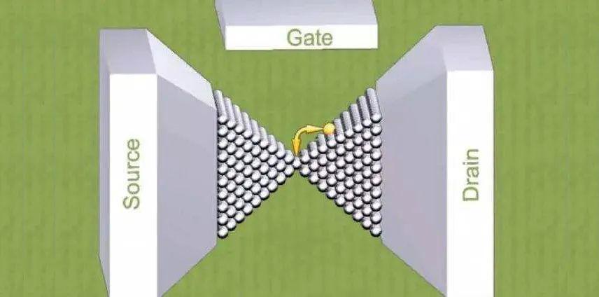 單原子晶體管(Single-Atom Transistor),在這種晶體管中,控制電極移動一個原子,該原子可以連接兩端之間的微小間隙,從而使電流能夠流動。原則上,它的工作原理就像一個有兩個穩定狀態的繼電器。