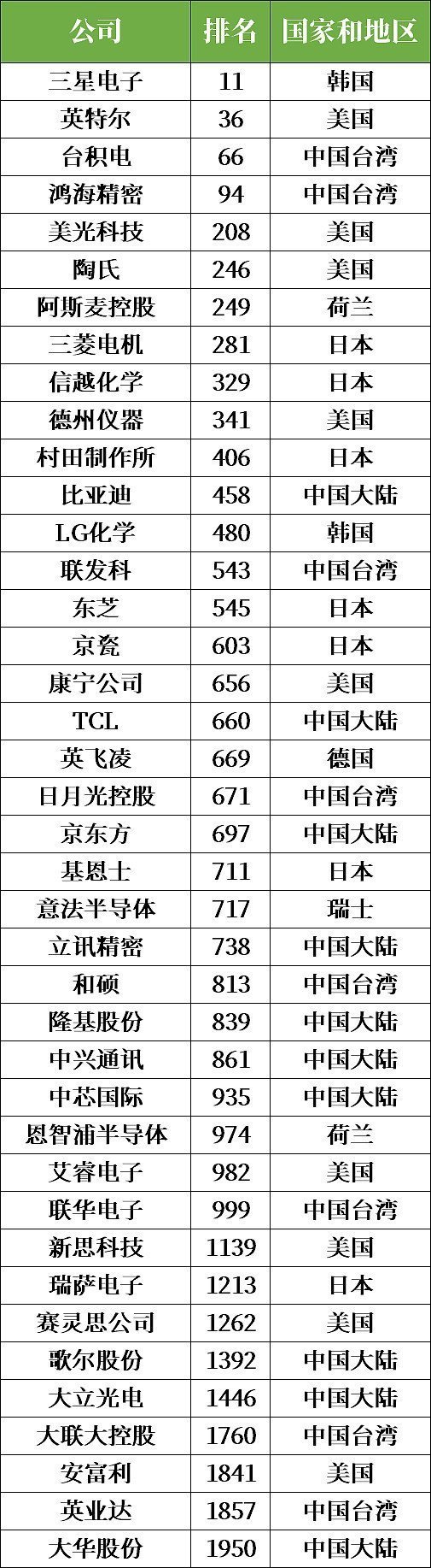 據(jù)統(tǒng)計2000強(qiáng)榜單中有41家半導(dǎo)體相關(guān)公司其中包括中國大陸企業(yè)10家中國臺灣企業(yè)9家