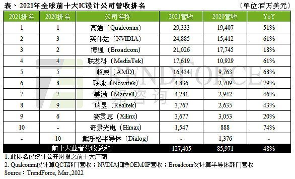 據(jù)TrendForce集邦咨詢研究顯示2021年由于各類終端應(yīng)用需求強(qiáng)勁導(dǎo)致晶圓缺貨全球IC產(chǎn)業(yè)嚴(yán)重供不應(yīng)求連帶使芯片價格上漲拉抬2021年全球前十大IC設(shè)計業(yè)者營收至1,274億美元年增48%